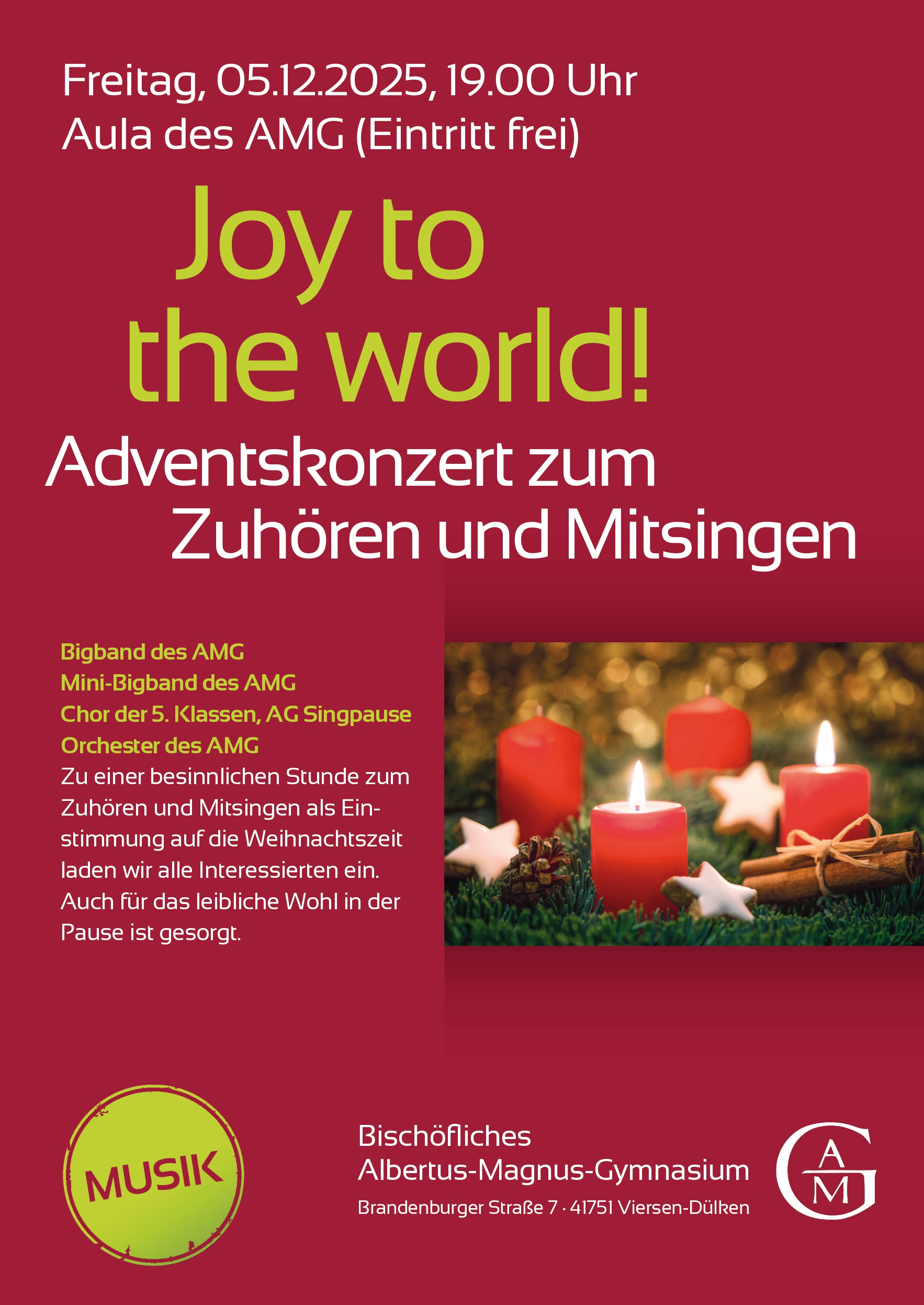 Unter dem Motto „Joy tot he world!“ laden das Orchester, die Bigband und der Chor der fünften Jahrgangsstufe des AMG sowie die AG Singpause zu einer besinnlichen Stunde mit adventlich-weihnachtlicher Musik zum Zuhören und Mitsingen ein. „Wir freuen uns über viele Zuhörer und vor allem auch Mitsingende“, betont Bernd Eickhoff, Musiklehrer und Leiter des Orchesters am AMG.