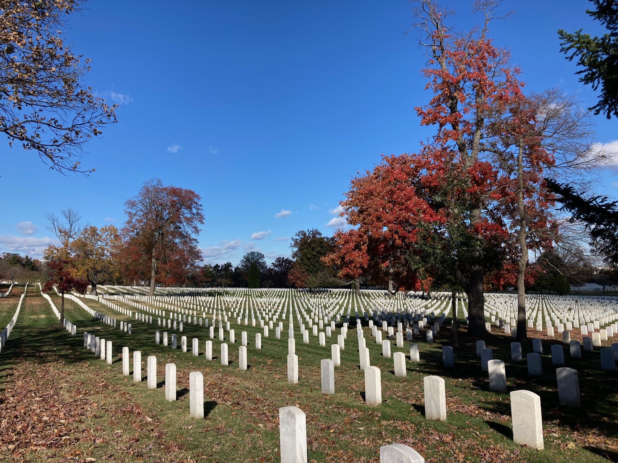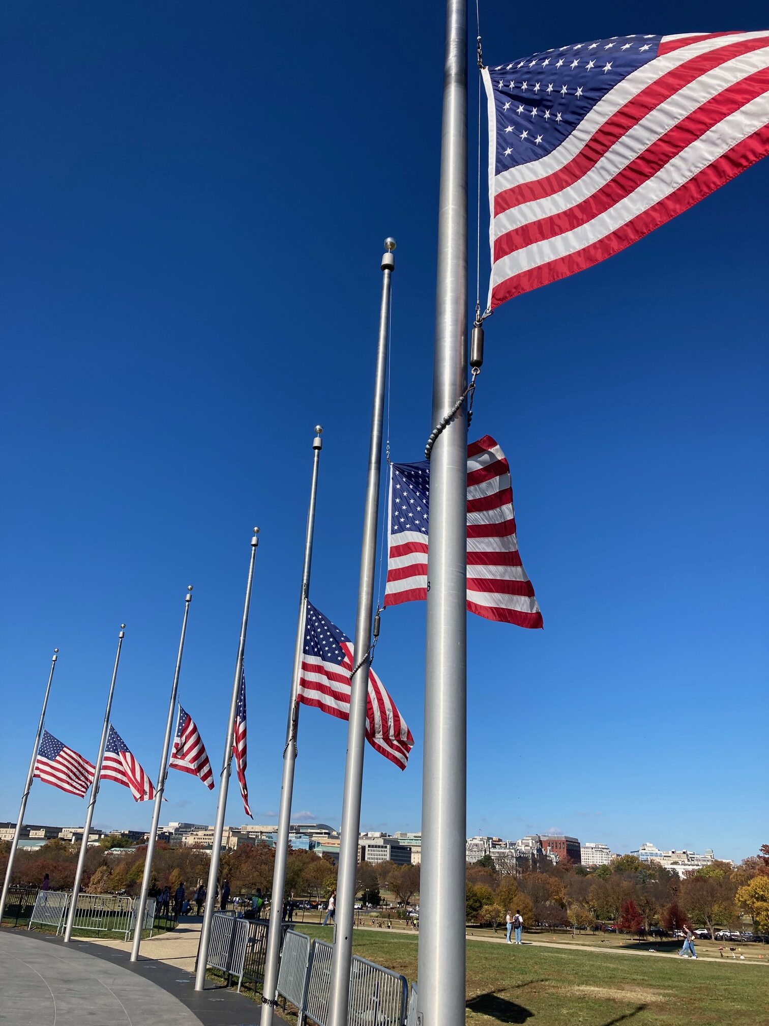 Den Arlington Cemetery besuchten wir am vierten Tag. Spätestens, als Donald Trump in seiner Limousine an uns vorbeifuhr, waren wir alle hellwach. Auf dem Arlington Friedhof sahen wir uns dann die Grabsteine der gefallenen Soldaten und auch das Denkmal von John F. Kennedy sowie seiner Familie an, wo auch ein ewiges Licht steht. Da Donald Trump im Amphitheater eine Rede für den Veterans Day hielt, mussten wir einige Zeit warten. Als er schließlich fertig war, gingen wir weiter Richtung Amphitheater. Es war ein Moment gemischter Gefühle, als wir dort standen, wo vor wenigen Minuten noch der Präsident der USA eine Rede gehalten hatte, und wir beobachteten, wie sein Rednerpult abgebaut wurde. Danach schauten wir noch einen Teil des „Kranzablegens“ an, bevor wir uns auf den Weg zum Pentagon machten. Das Kranzablegen am Grab des Unbekannten Soldaten ist Teil der traditionellen Veterans–Day–Zeremonie und dient dem Gedenken aller gefallenen amerikanischen Soldaten. Am Pentagon besuchten wir dann das Memorial von 9/11.