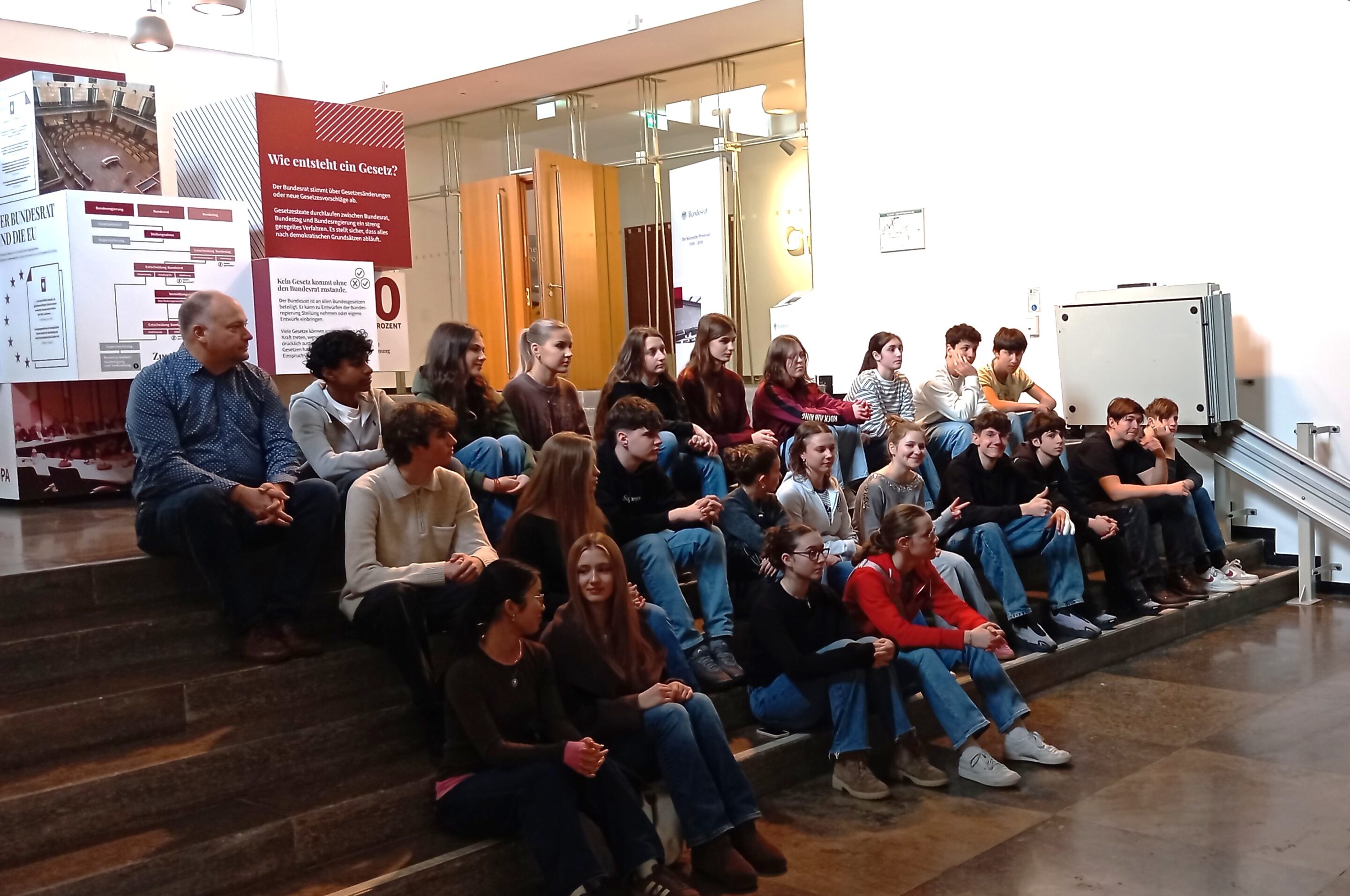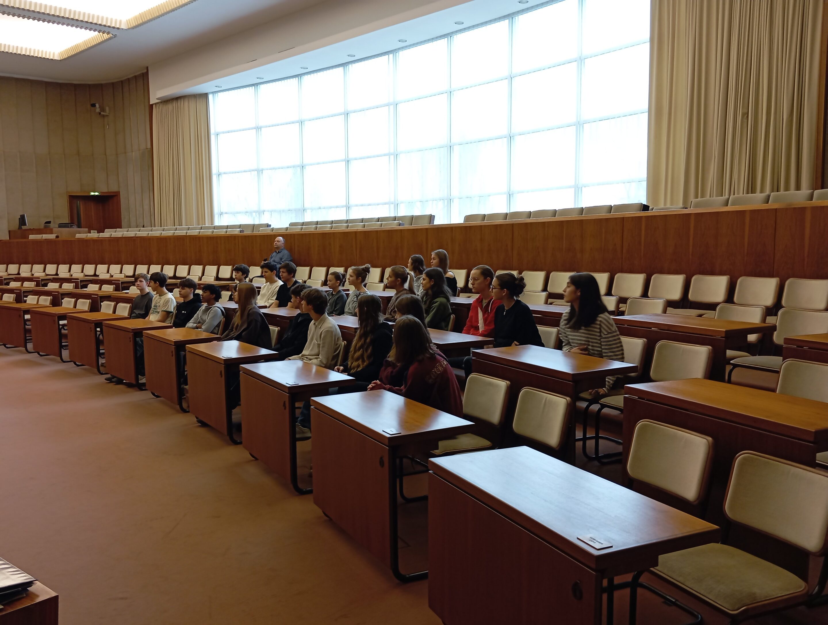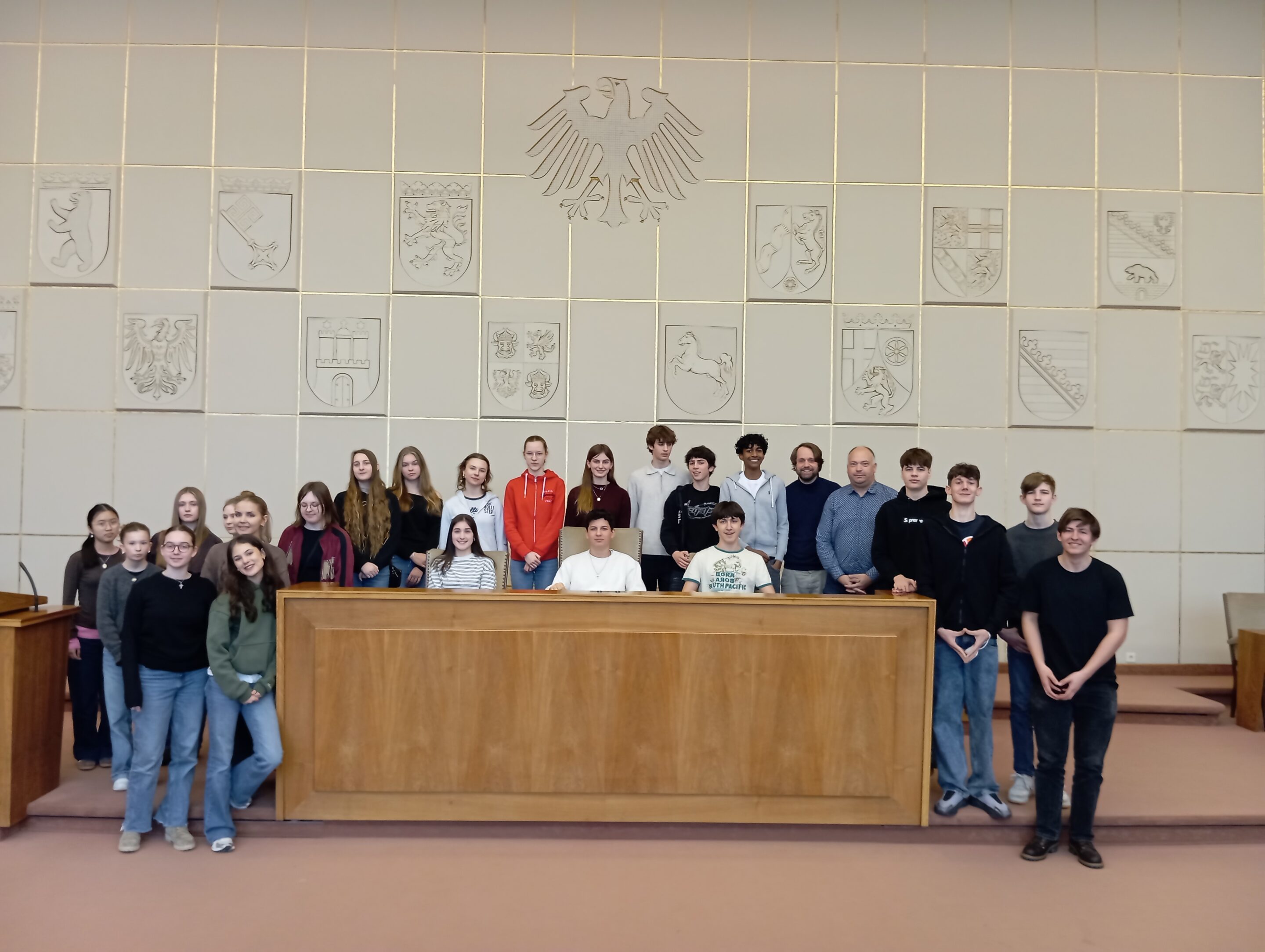 Am 13.03.2026 machte sich die 10 d in Begleitung von Herrn Zelkes und Herrn Hütz auf dem Weg ins alte Regierungsviertel nach Bonn, um dort an einem besonderen Workshop im Bonner Plenarsaal des Bundesrates teilzunehmen, wo am 23. Mai 1949 das Grundgesetz verkündet würde. Nach einer historischen Führung durch das Gebäude bekamen unsere Schülerinnen und Schüler in einem Rollenspiel die Aufgabe, einen von der Bundesregierung vorbereiteten Gesetzentwurf aus der Sicht der Länder zu diskutieren und ihn am Ende zur Abstimmung zu stellen, wobei sie ihre Redebeiträge von den Rednerpulten aus formulieren durften, an denen bereits Adenauer, Brandt und Kohl gestanden haben. Historisch politische Bildung einmal in anderer Form, die allen bestimmt lange in Erinnerung bleiben wird.