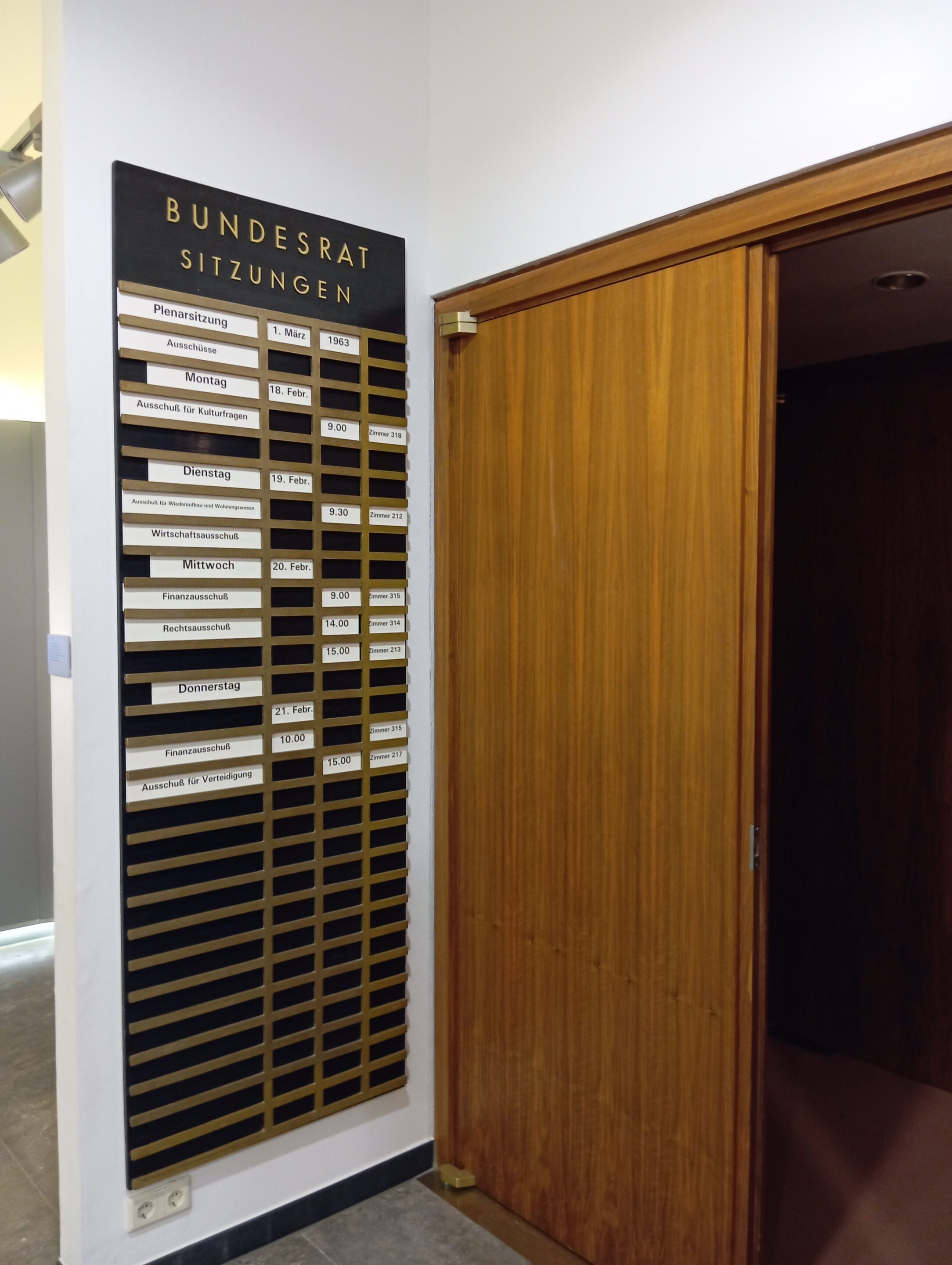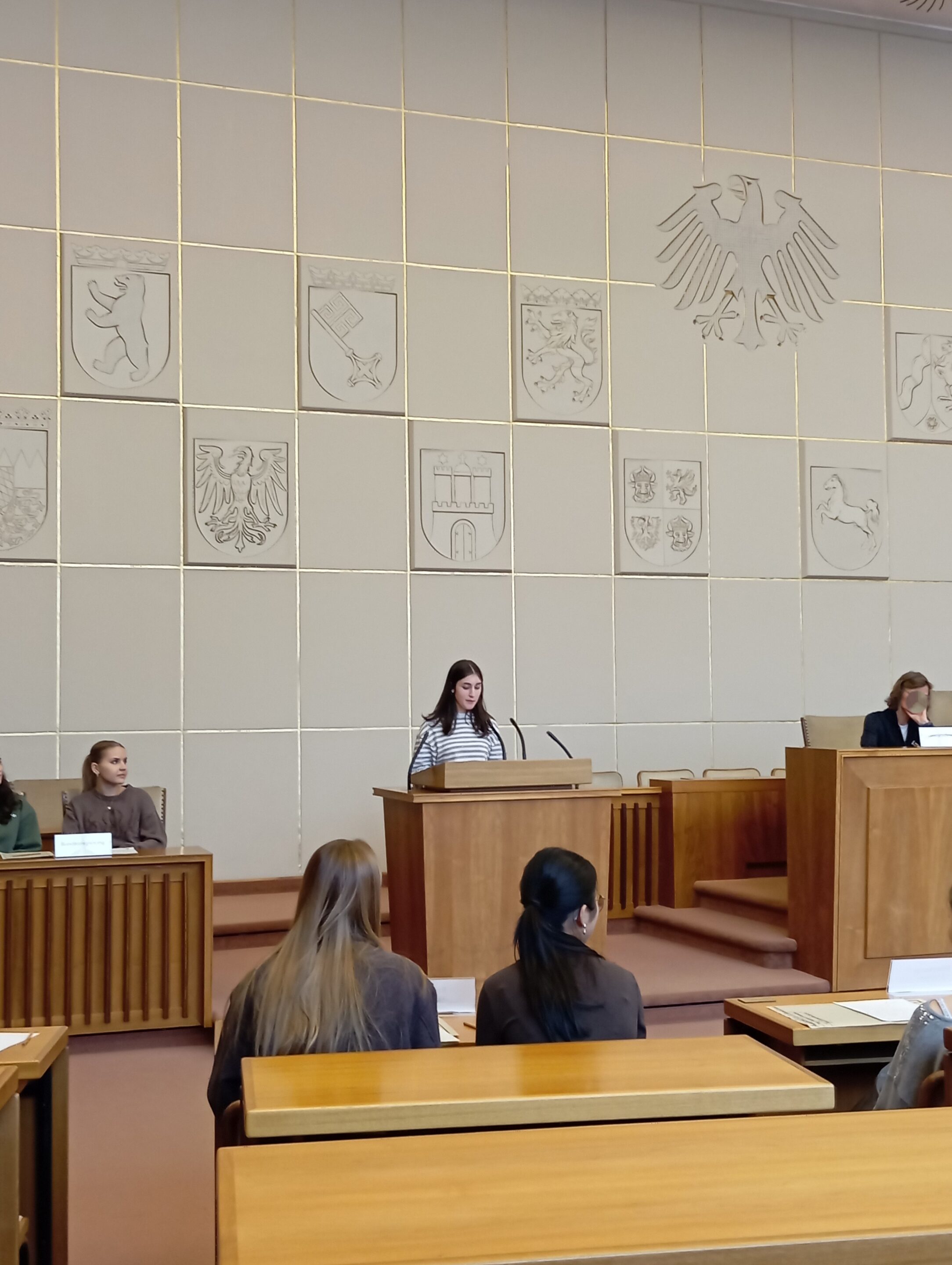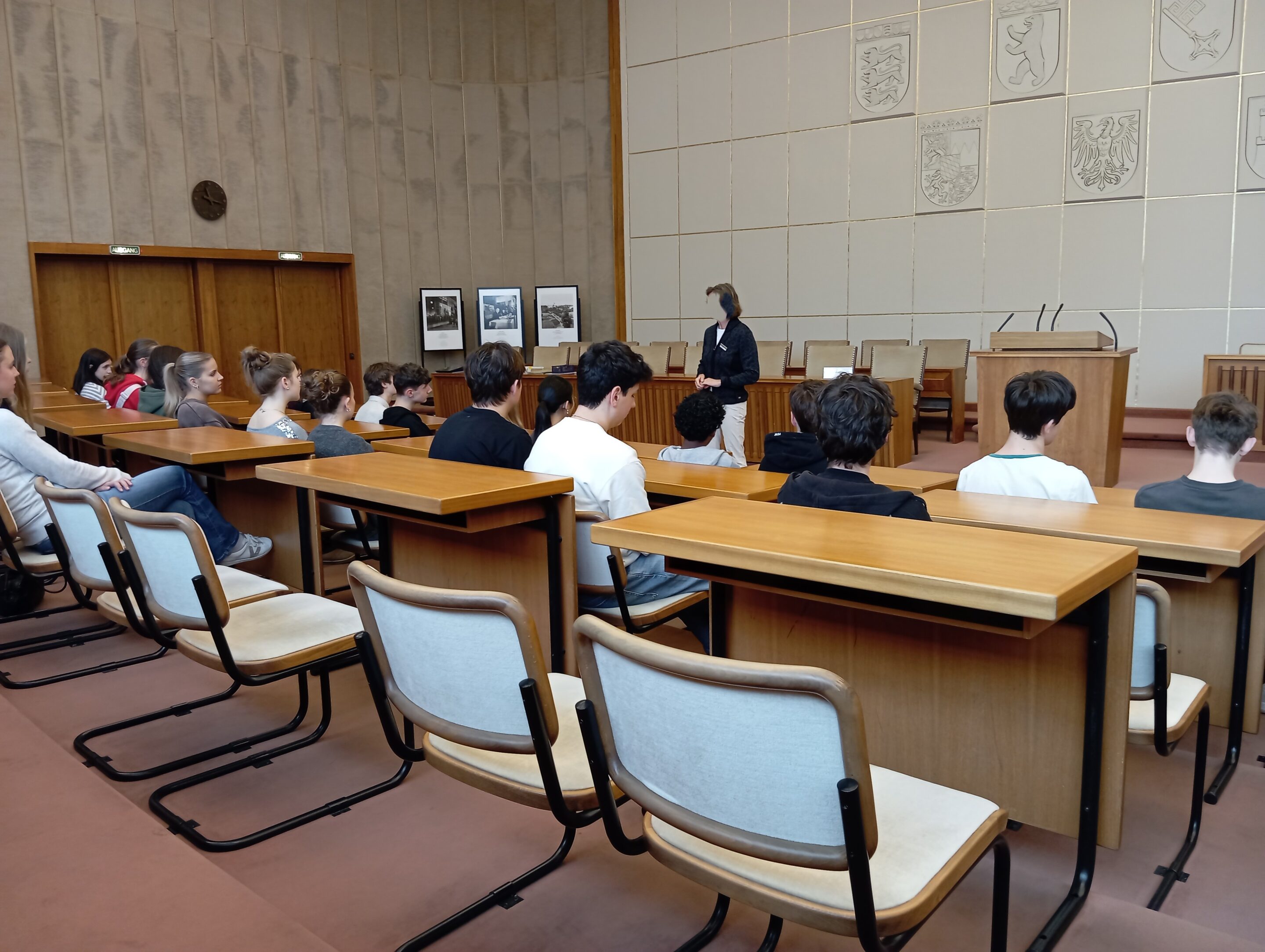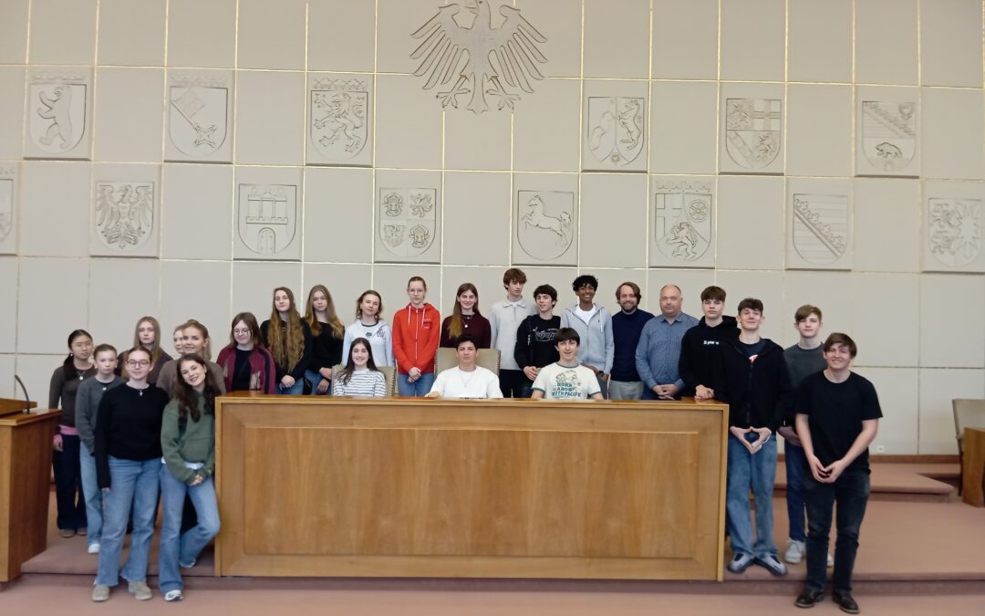 Am 13.03.2026 machte sich die 10 d in Begleitung von Herrn Zelkes und Herrn Hütz auf dem Weg ins alte Regierungsviertel nach Bonn, um dort an einem besonderen Workshop im Bonner Plenarsaal des Bundesrates teilzunehmen, wo am 23. Mai 1949 das Grundgesetz verkündet würde. Nach einer historischen Führung durch das Gebäude bekamen unsere Schülerinnen und Schüler in einem Rollenspiel die Aufgabe, einen von der Bundesregierung vorbereiteten Gesetzentwurf aus der Sicht der Länder zu diskutieren und ihn am Ende zur Abstimmung zu stellen, wobei sie ihre Redebeiträge von den Rednerpulten aus formulieren durften, an denen bereits Adenauer, Brandt und Kohl gestanden haben. Historisch politische Bildung einmal in anderer Form, die allen bestimmt lange in Erinnerung bleiben wird.