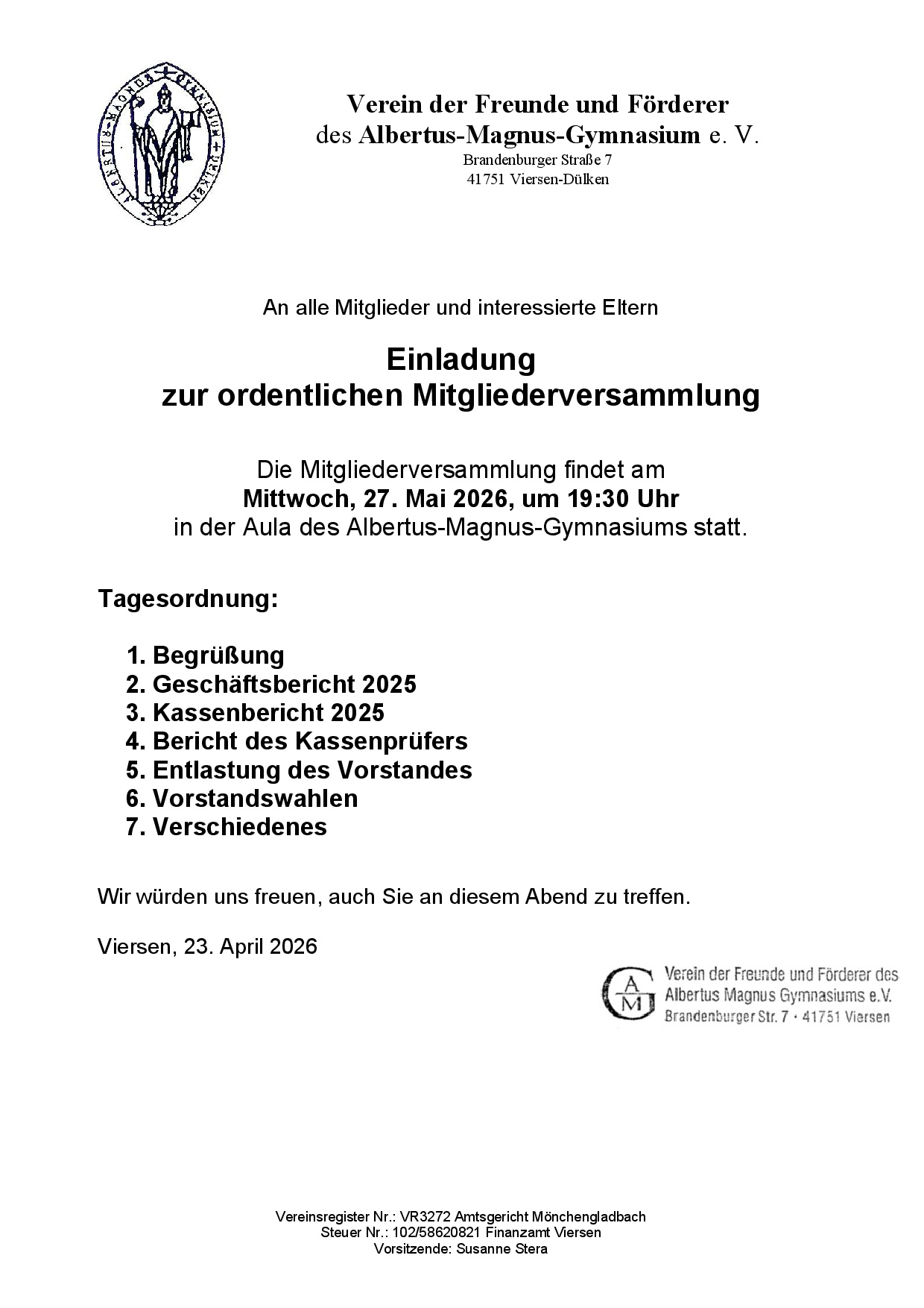 Der Verein der Freunde und Förderer des AMG lädt alle Mitgliederinnen, Mitglieder und Interessierte zur ordentlichen Mitgliederversammlung am 27. Mai ganz herzlich ein.